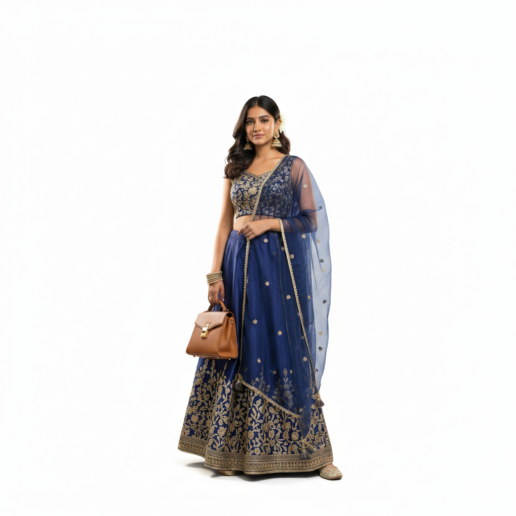 Step into an aura of regal elegance with our Midnight Indigo Lehenga Set. Designed for the modern woman who cherishes traditional artistry, this ensemble captures the mystery of the night sky paired with the opulence of golden eras. Whether you are attending a wedding reception, a festive gala, or a special celebration, this outfit is crafted to make you the center of attention.